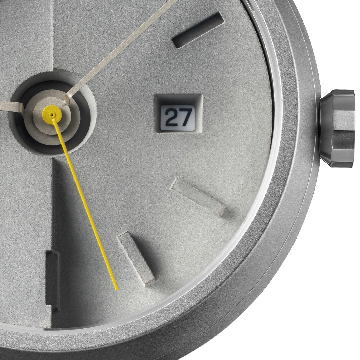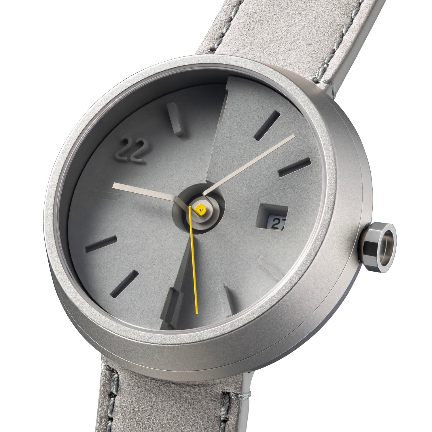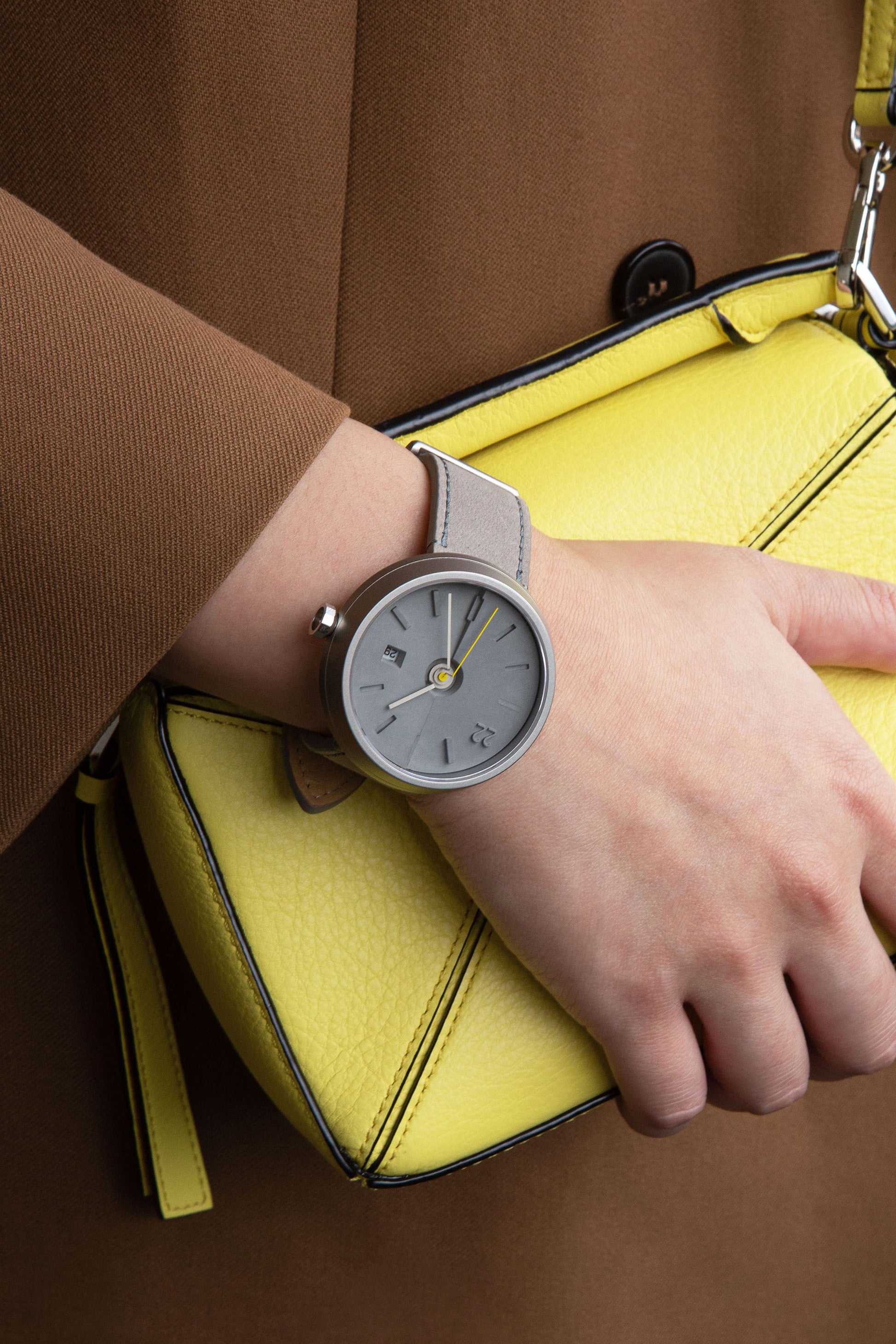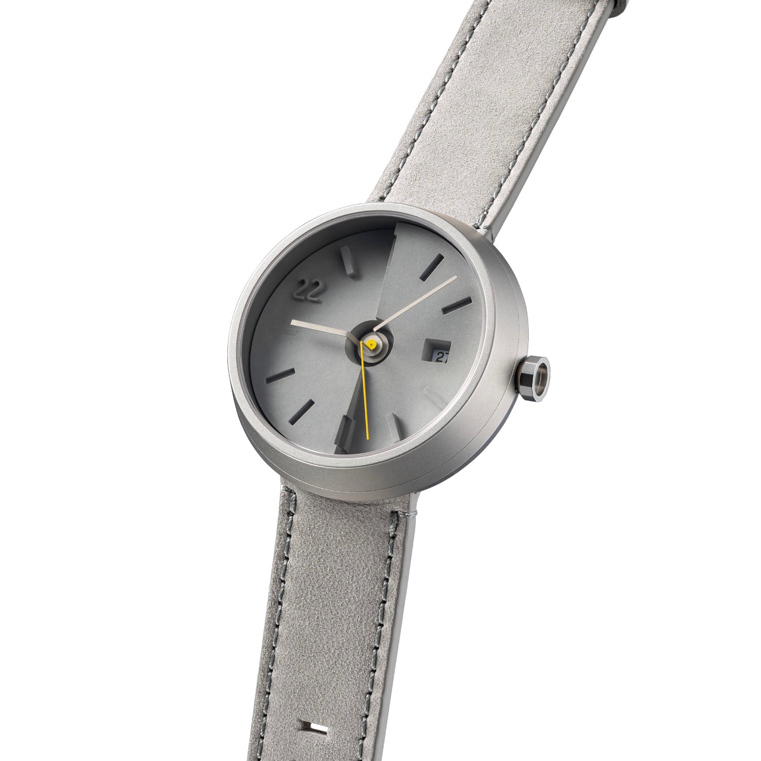 A trilogy of grey materials── stainless steel, leather strap and dial of concrete’s original colour. Playing with a variety of grey textures and levels of detail; if speaking of the signature style of 22STUDIO, no others can take its spot. With the fluorescent yellow second hand, the contrast in colour enhances the overall visual effect, making the watch especially eye-catching.