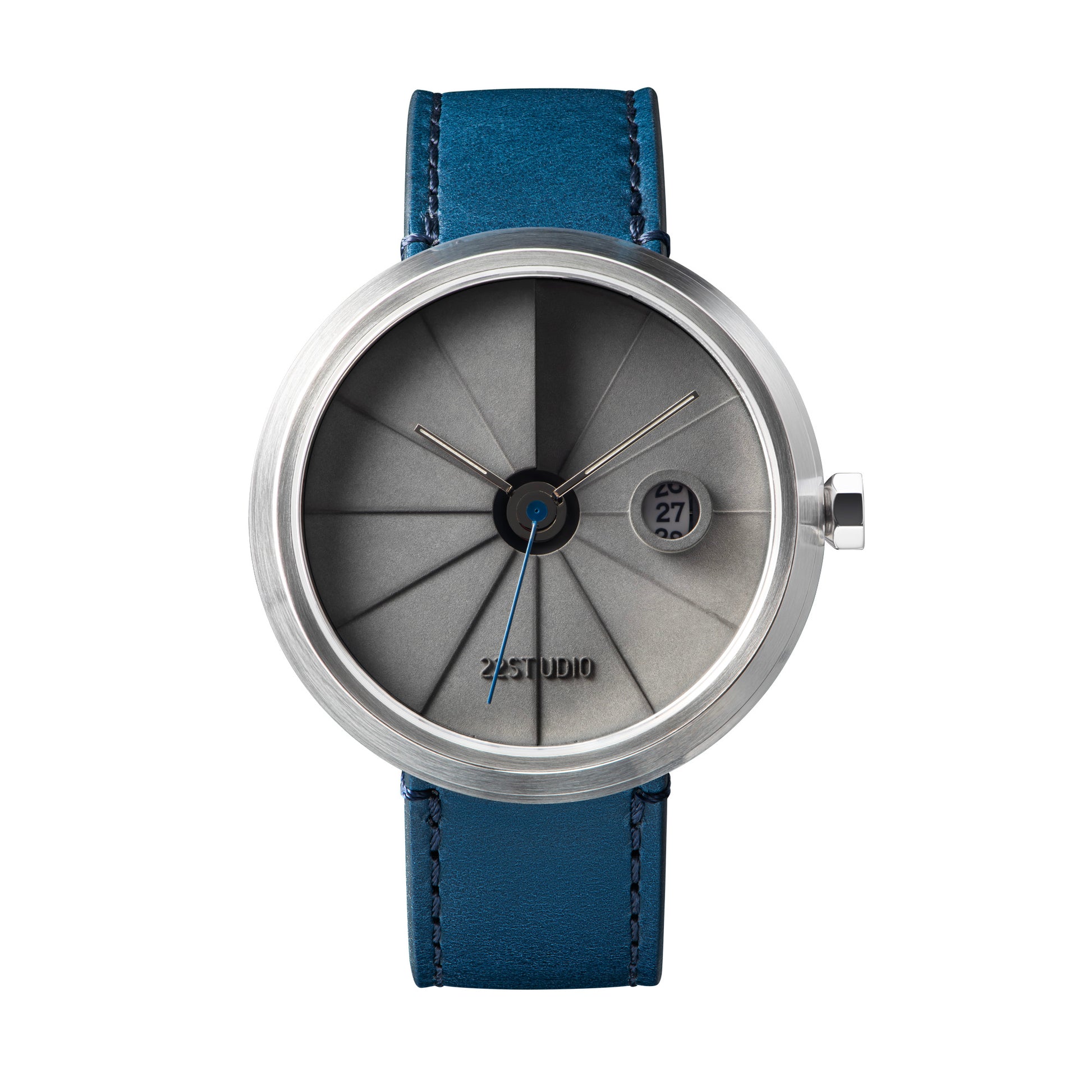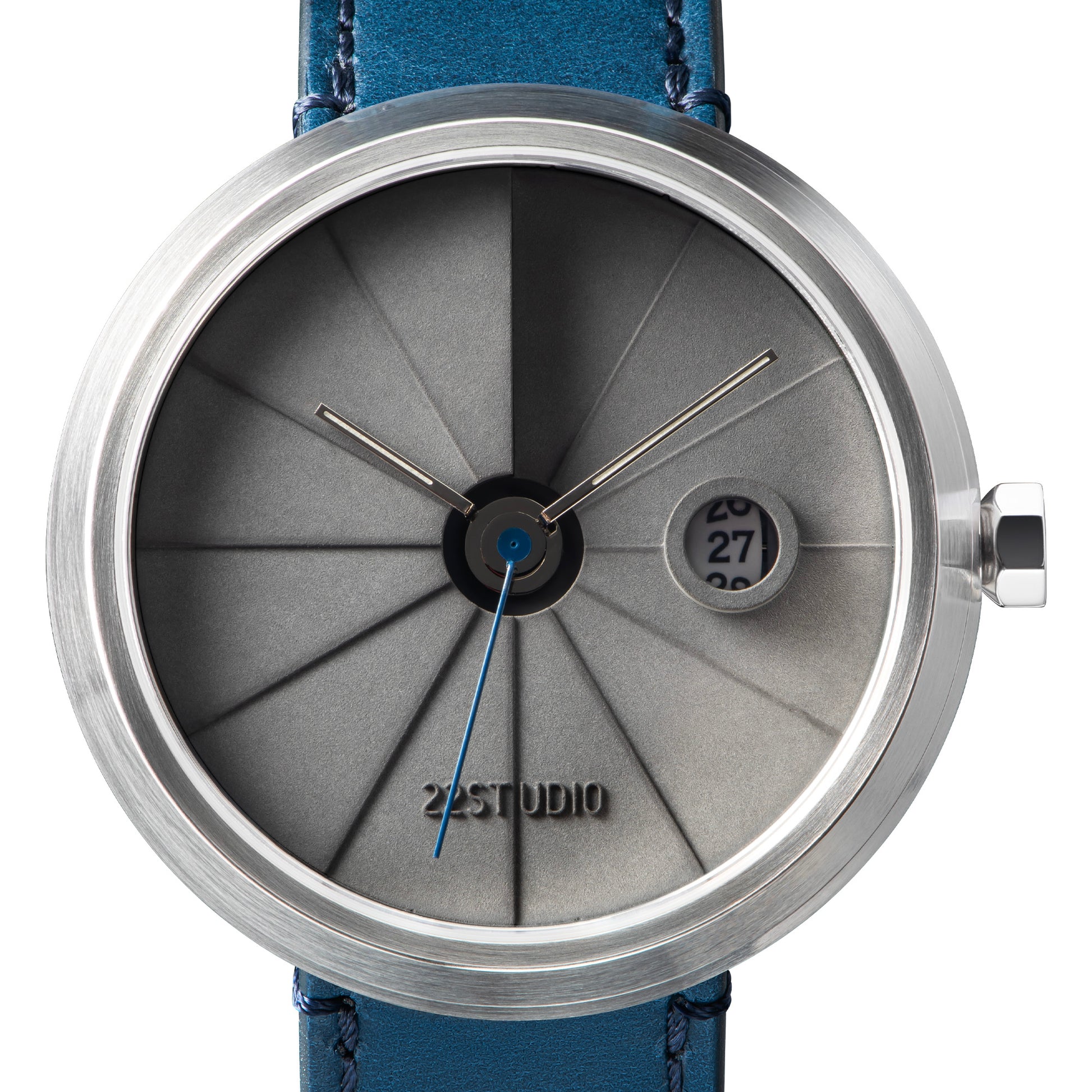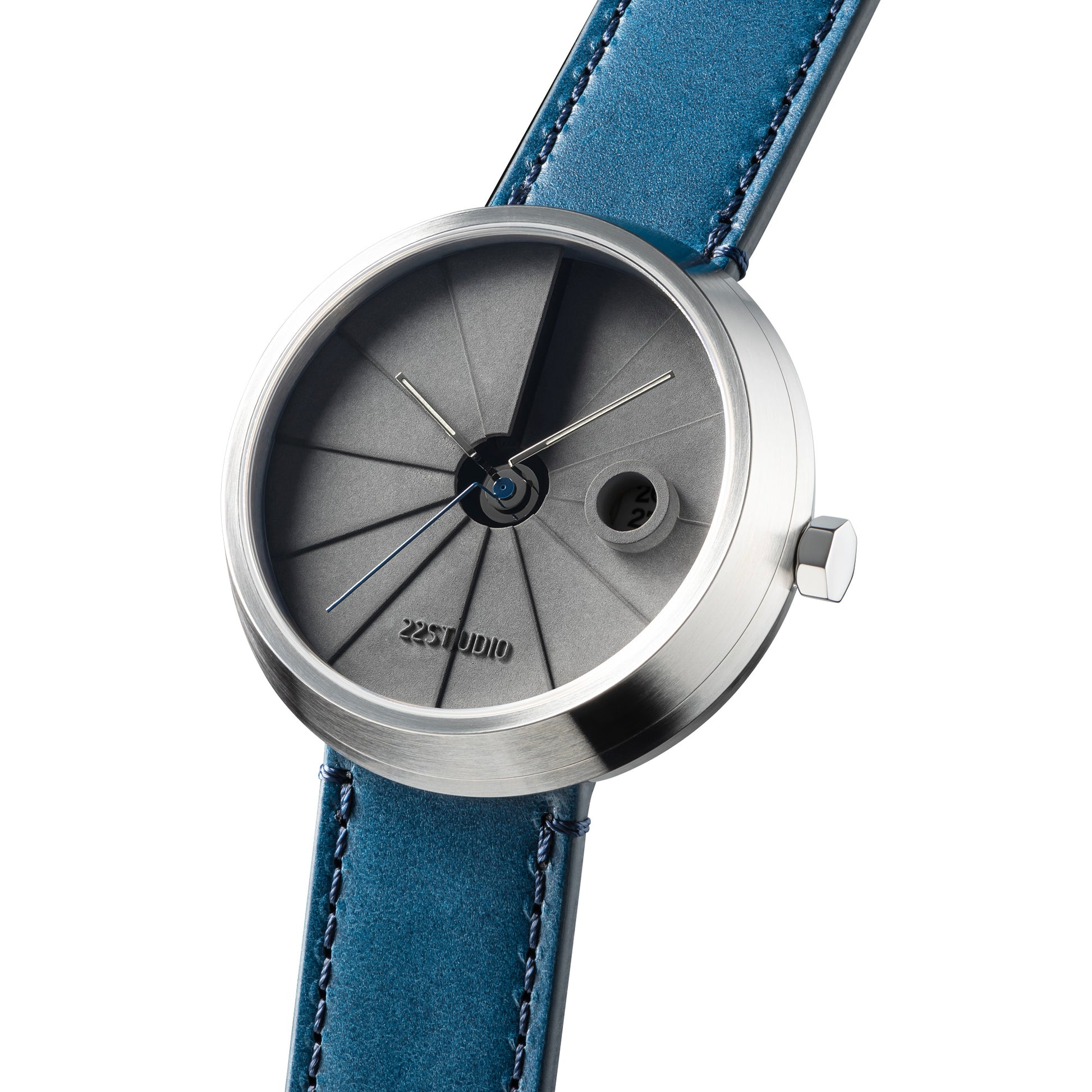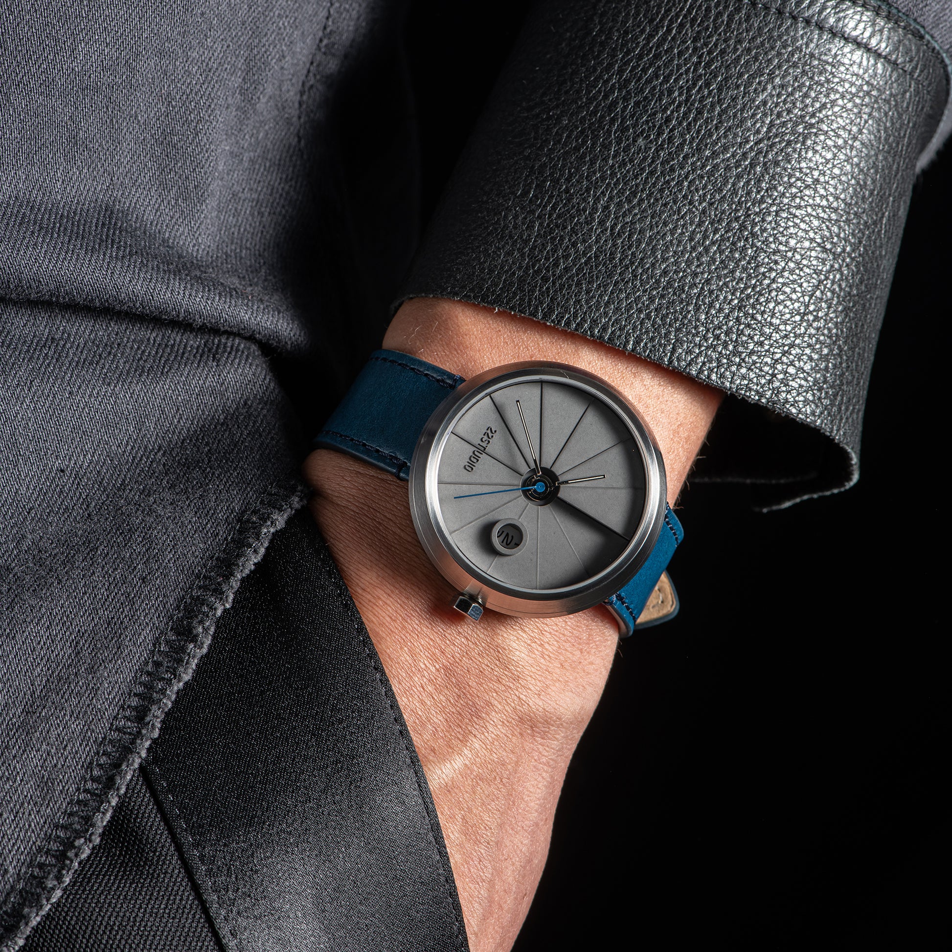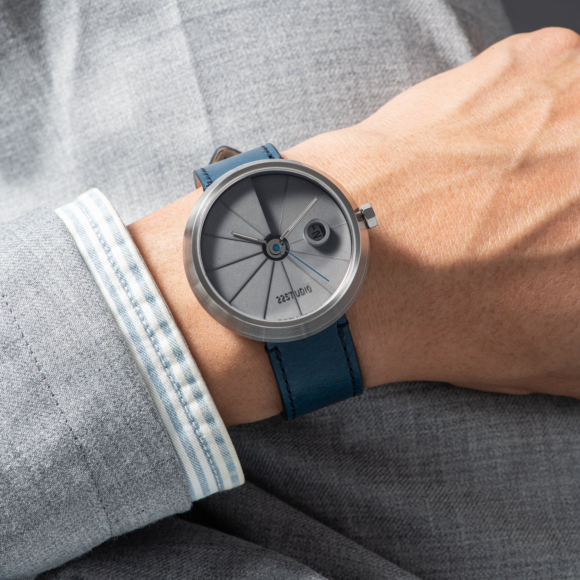 Shiny silver hour and minute hands, bright blue second hand, paired with a blue vegetable-tanned leather strap and a dark grey cured concrete dial. The style is somewhat yuppie casual, but it also looks smart with formal attire.